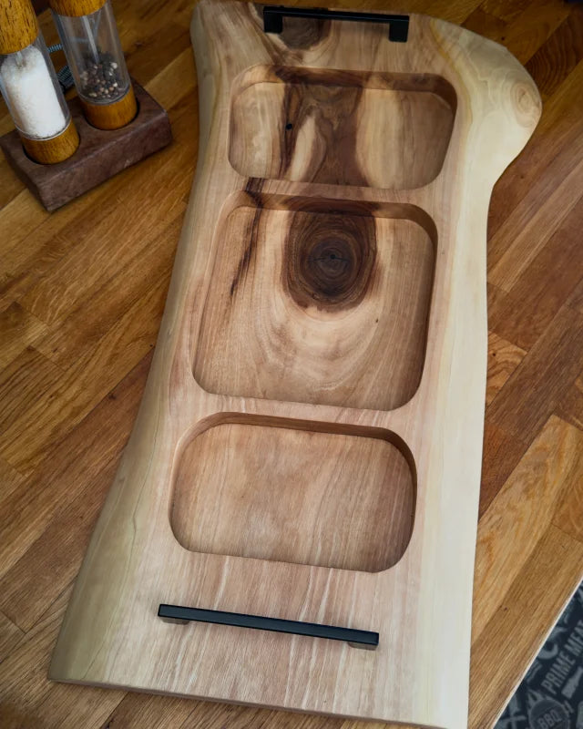 The Pitmaster Board XL, crafted from premium walnut, combines a timeless look with sophisticated functionality. The three practical cutouts provide space for dips, side dishes, or herbs—ideal for serving meat in style.