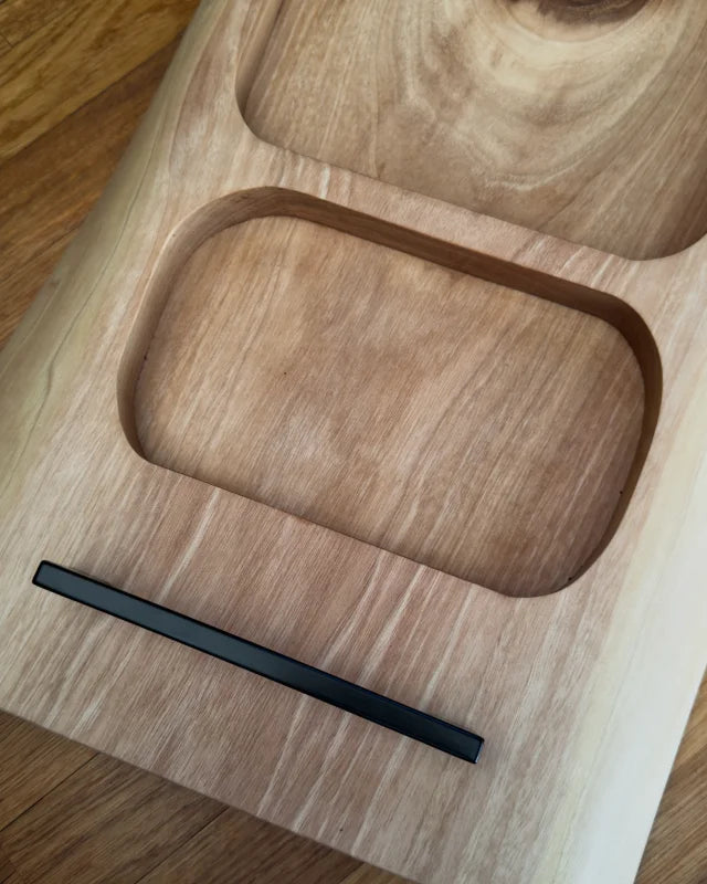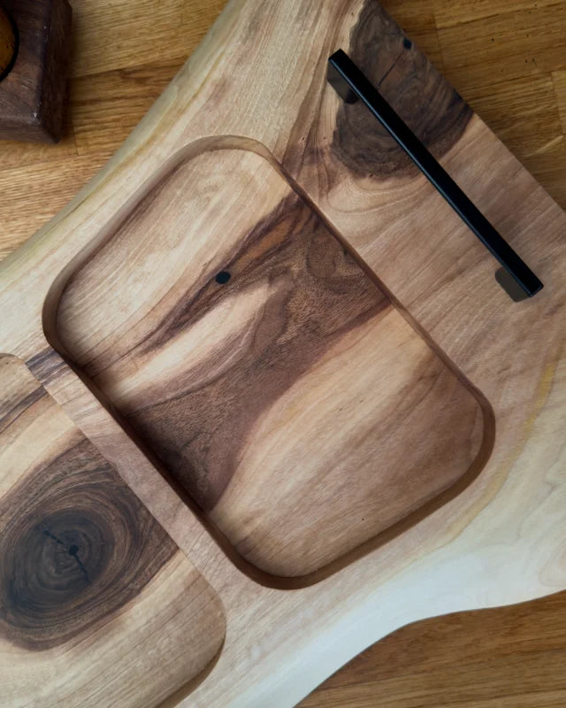 Handgefertigtes Unikat aus massivem Nussbaum, 70×30×4 cm stark, mit schwarzen Griffen – einzigartig im Design und in dieser Form kaum zu finden.