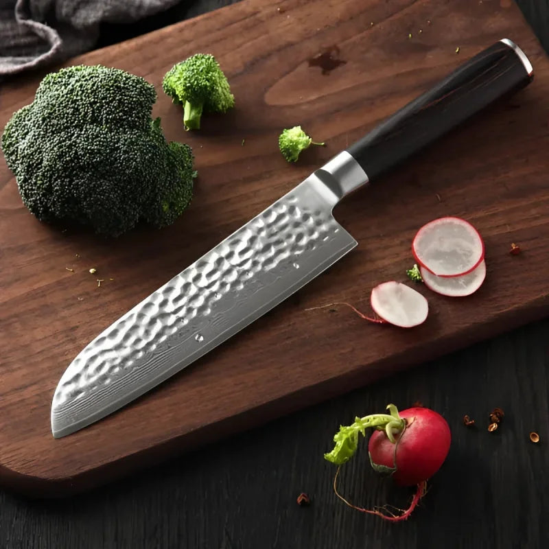 Du kannst wählen zwischen Nakiri, Santoku, Chefmesser oder Brotmesser, jeweils passend zu Deiner Schneidaufgabe und Vorlieben.