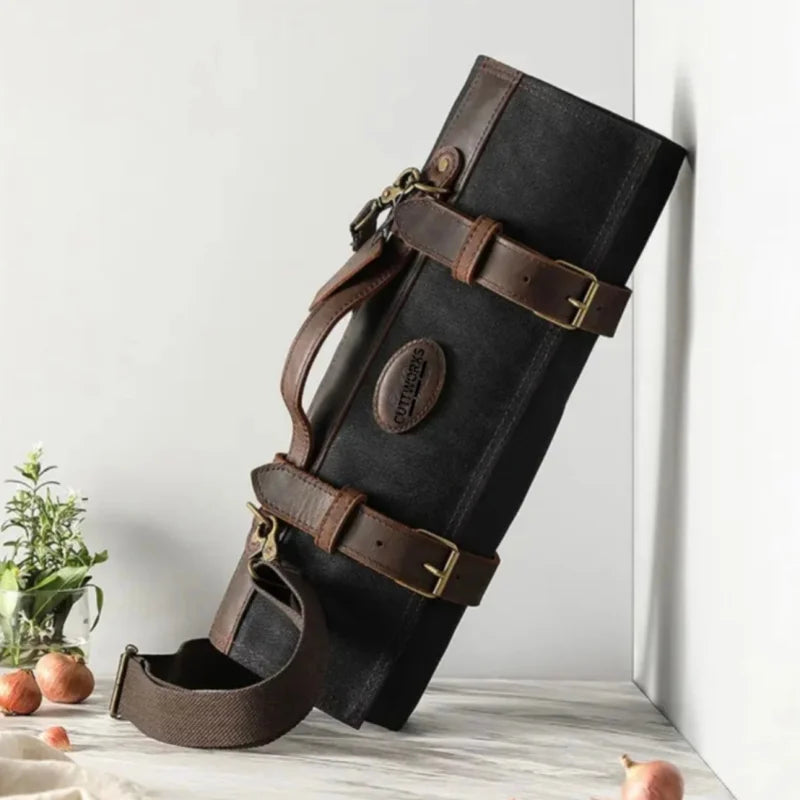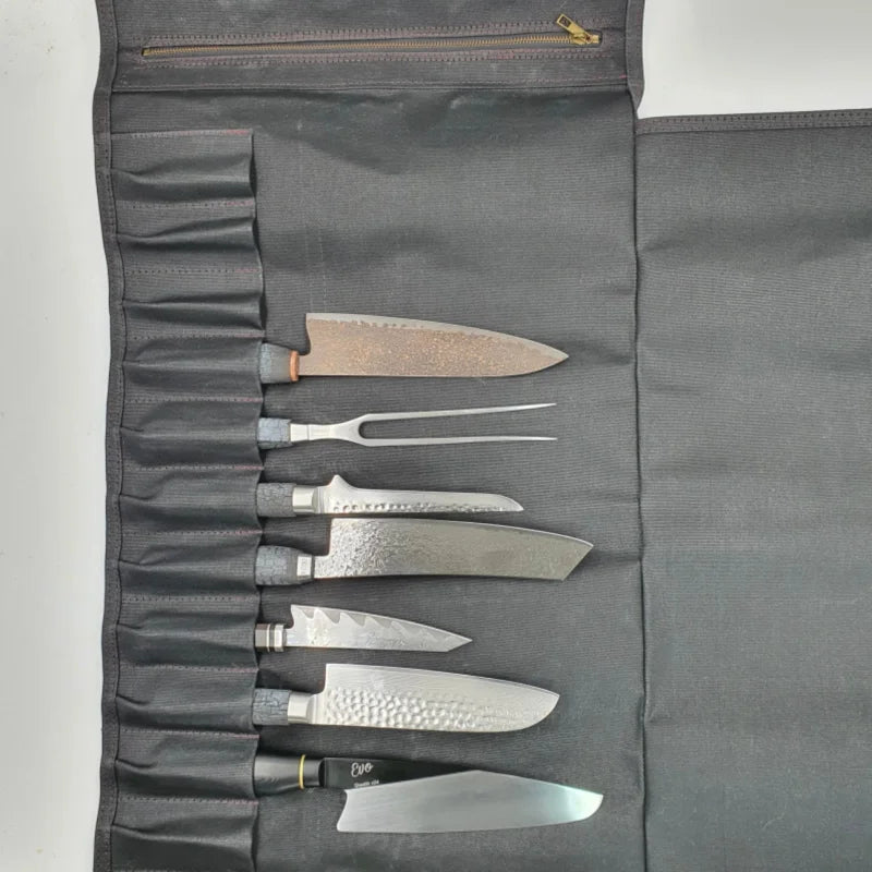 Die Tasche bietet Platz für bis zu 12 Küchenmesser (z.B. Kochmesser, Santoku, Nakiri, Filetier-/Ausbeinmesser) sowie Zubehör wie Wetzstahl oder Pinzette. Bitte Messer mit Klingenschutz einstecken; die Tasche wird ohne Messer/Zubehör geliefert.