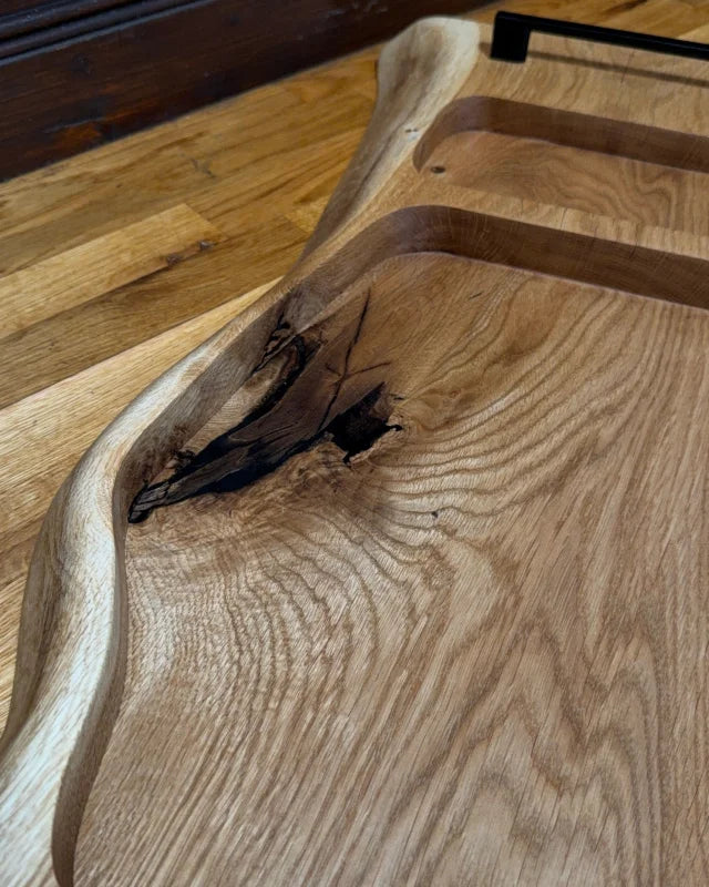 Eiche-Vollholz mit organischen Raendern, dunkler Astmaserung und vier praezisen Ausfraesungen – plus austauschbare Schwarzgriffe. Charakterstark, buehnenreif und bereit fuer BBQ & Tisch.