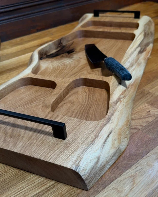 Eiche Vollholz mit organischen Raendern dunkler Astmaserung und vier Ausfraesungen plus austauschbare Schwarzgriffe buehnenreif fuer BBQ und Tisch.