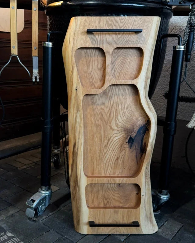 Le plateau Pitmaster Board ContourEdge est votre planche à servir et à découper en un seul morceau de chêne – avec des bords organiques et une veinure sombre de nœuds qui met en valeur les lignes du bois. L'épaisseur de 4 cm apporte de la stabilité au travail, des poignées en métal noir assurent un port ergonomique. Quatre découpes précises structurent la présentation : 1× allongée-grande sur le côté, 2× plus petites sur le côté opposé (l'une d'elles un peu plus longue) et la découpe principale – idéale pour les sauces, les accompagnements, les herbes et les accents visuels.