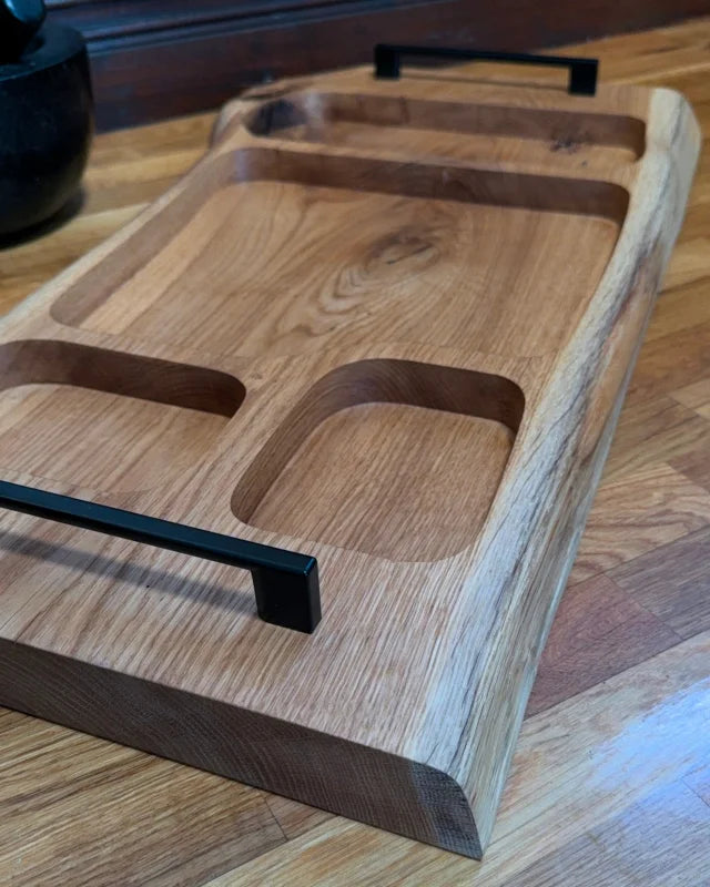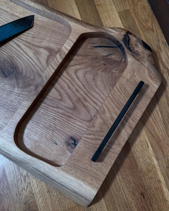 Eiche-Vollholz mit natuerlicher Form und vier praezisen Ausfraesungen – klar strukturiert, charaktervoll gemasert und bereit fuer BBQ, Tranchieren und Servieren.