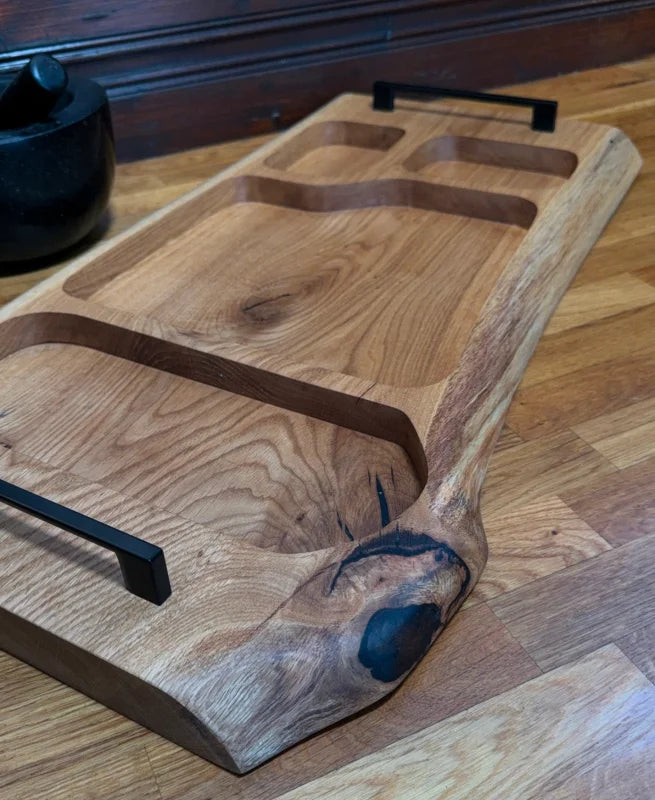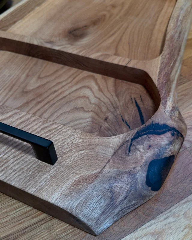 Walnuss-Servierplatte mit schwarzen Griffen und natürlicher Holzmaserung.
