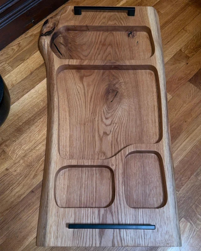 Le plateau Pitmaster Board SideFlow Quad est votre planche à servir et à trancher en un seul morceau de chêne – avec une belle forme naturelle et une veinure vivante. Quatre découpes précises structurent la présentation : 1× allongée-grande sur le côté, 2× plus petites sur le côté opposé (l'une d'elles un peu plus longue) ainsi que la découpe principale. Une épaisseur de 4 cm assure un travail stable ; finement poncé et huilé deux fois, la surface apporte profondeur et chaleur.