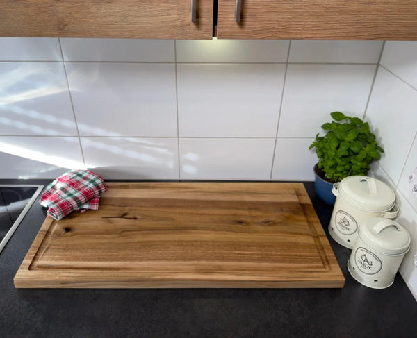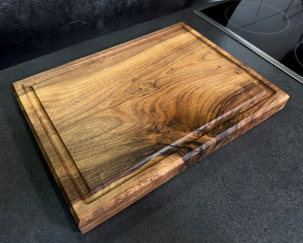 Nussbaum ist nicht einfach „dunkel“ – er ist warm. Und dieses echte Hell–Dunkel-Farbspiel macht jedes Brett zu einem Stück, das man gern offen stehen lässt: in der Küche, am Grill, auf dem Tisch.